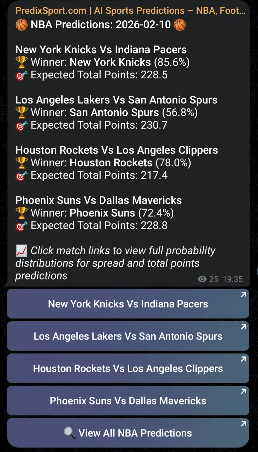Join our Telegram channel to receive daily AI-powered predictions for Tennis, NBA, and Football directly on your phone. Be the first to know when new match analyses are available.
